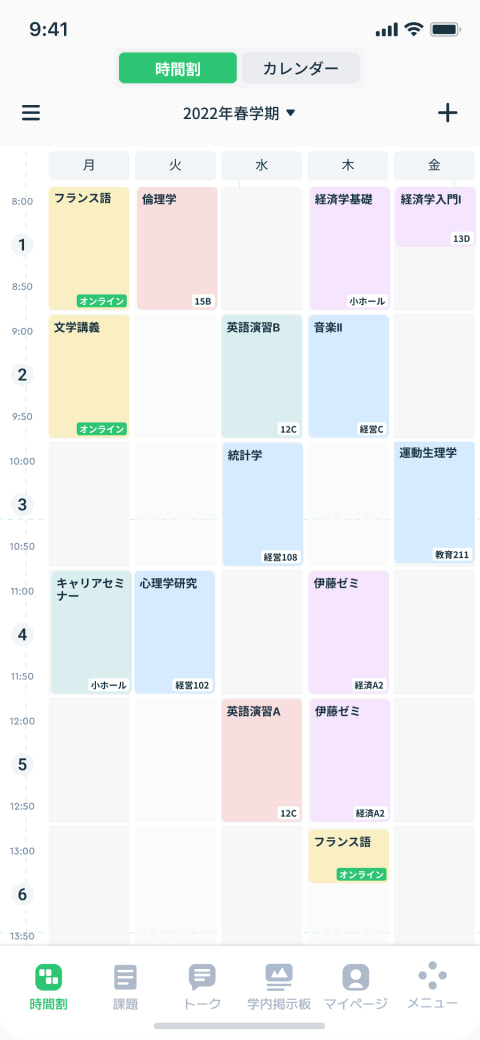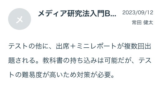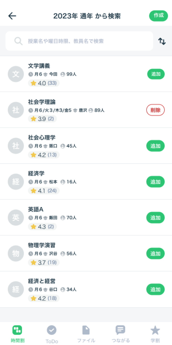 授業の曜日や時限で検索すると一発で自分の探していた授業が表示されて、ワンタップで時間割が組めるところがお気に入り。授業情報も入れなくていいから使いやすい!